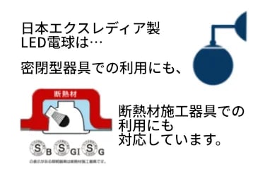 エクスレディアLED製品は、お風呂場などに見られる「密閉型器具」での利用や、天井のダウンライトなどに見られる「断熱材施工器具」での利用にも対応しています。